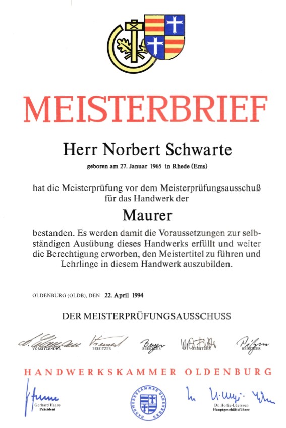 Ablegung Meisterprüfung im Maurerhandwerk am 22.04.1994