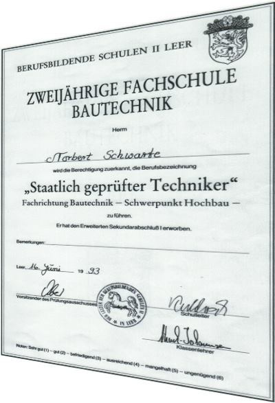 Staatlich geprüfter Techniker Fachrichtung Bautechnik - Fachrichtung Hochbau am 16.06.1993